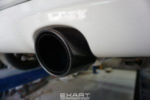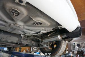 リアマフラーを製作するにあたって、この車両の純正マフラーはセンターパイプから一本物なので、製作が決定した際にオーナー様の目の前でセンターマフラーとリアマフラーをカットしリアマフラーが無い状態で音を聞いて頂きサイレンサーの仕様等を打ち合わせします。